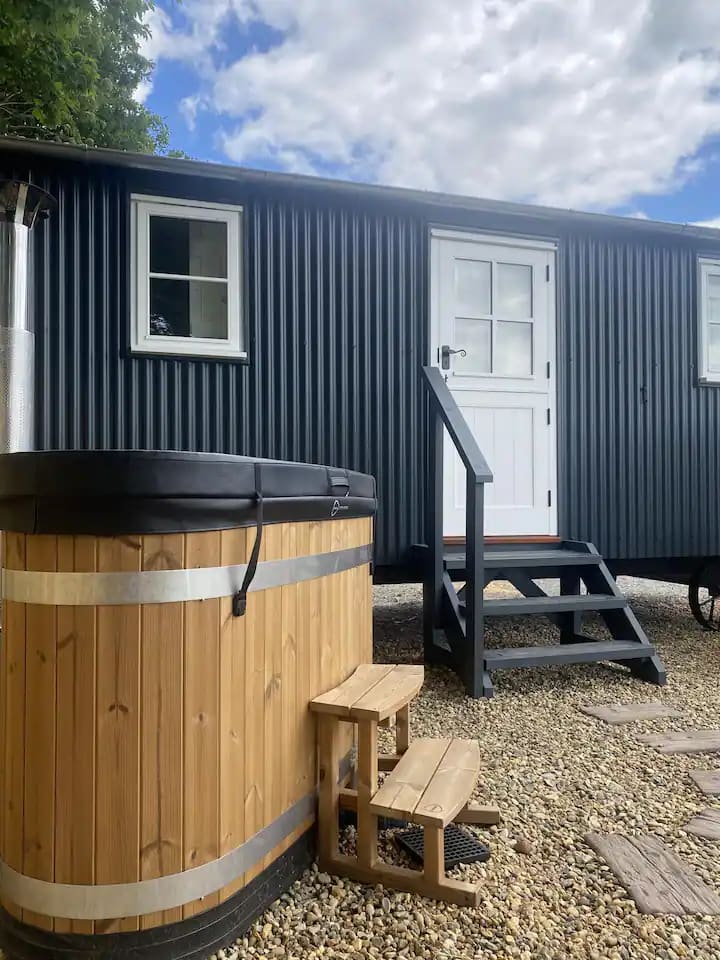 Ensuite, king sized cabin bed, lounge area, private garden with Wood Fired Hot Tub and outdoor seating, free WiFi. Please note the bed is cabin style with extra deep five star matress and higher than a standard height bed.