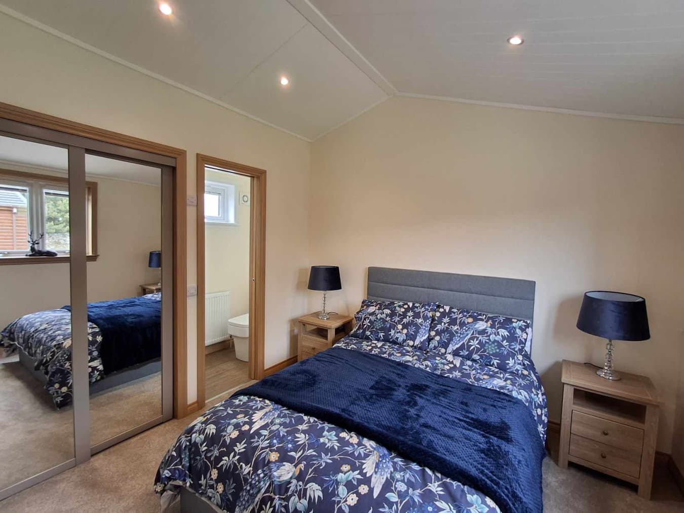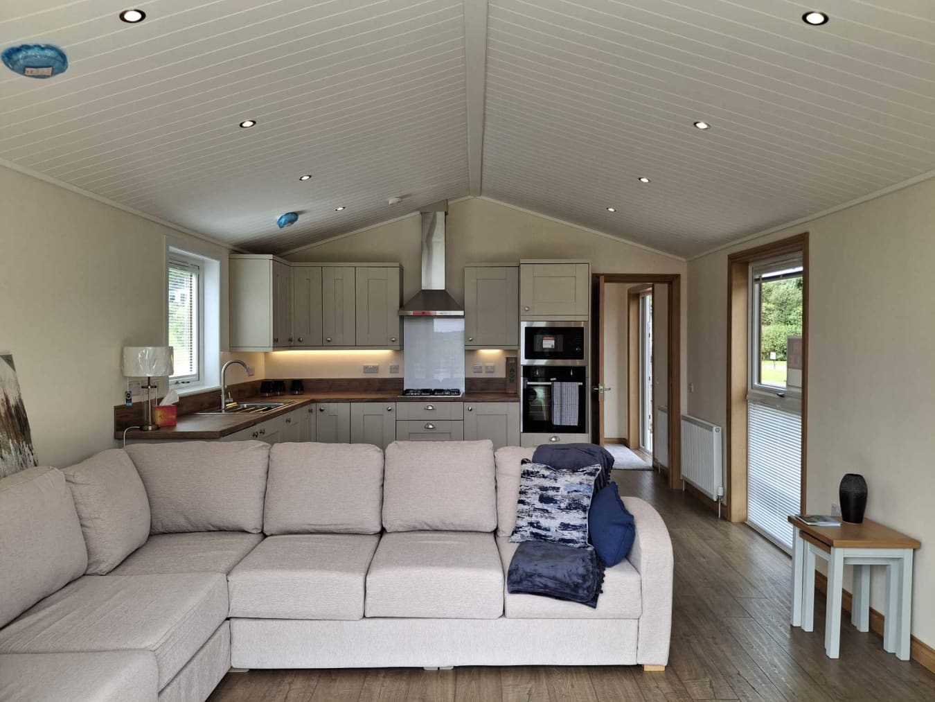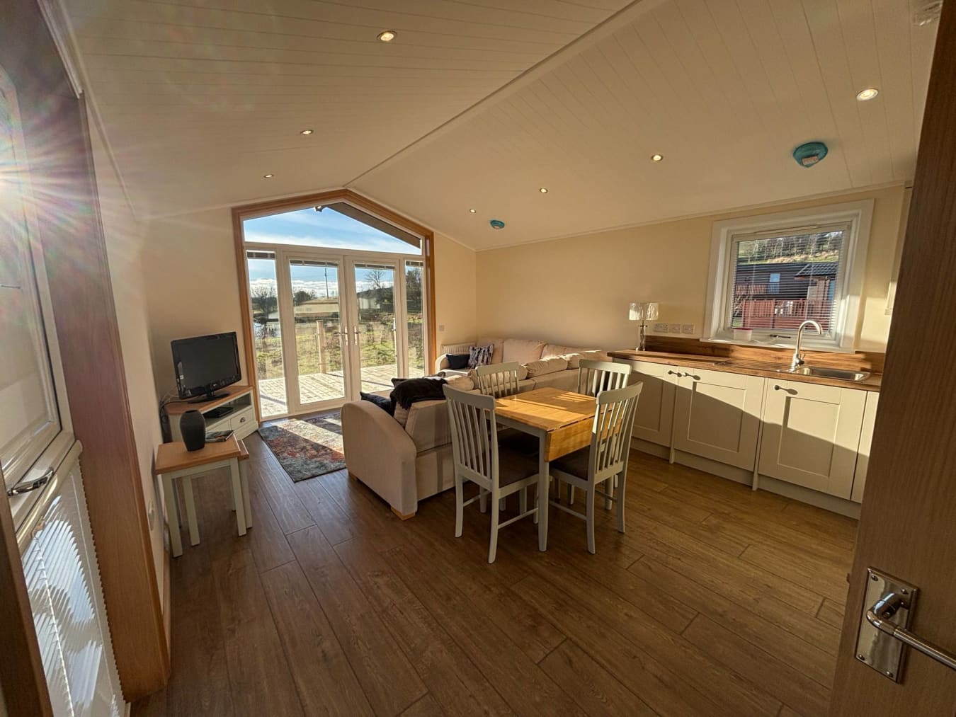 Our luxurious Hunter lodge is built to residential spec and has a large private decking area with beautiful views directly across our lochan, with easy access to two on-site dog walks. There is a fully-equipped kitchen with a spacious open plan living and dinning area. There is a king-size master bedroom has an en-suite toilet, a second bedroom with two full-size single beds, and a generous-sized bath/shower. The smart TV and 5G router with unlimited data ensures you are well equip for streaming, browsing or working remotely! The price includes the beds being made up ready for your arrival, towels, electric and gas for your stay. Each holiday home has a parking space beside it.