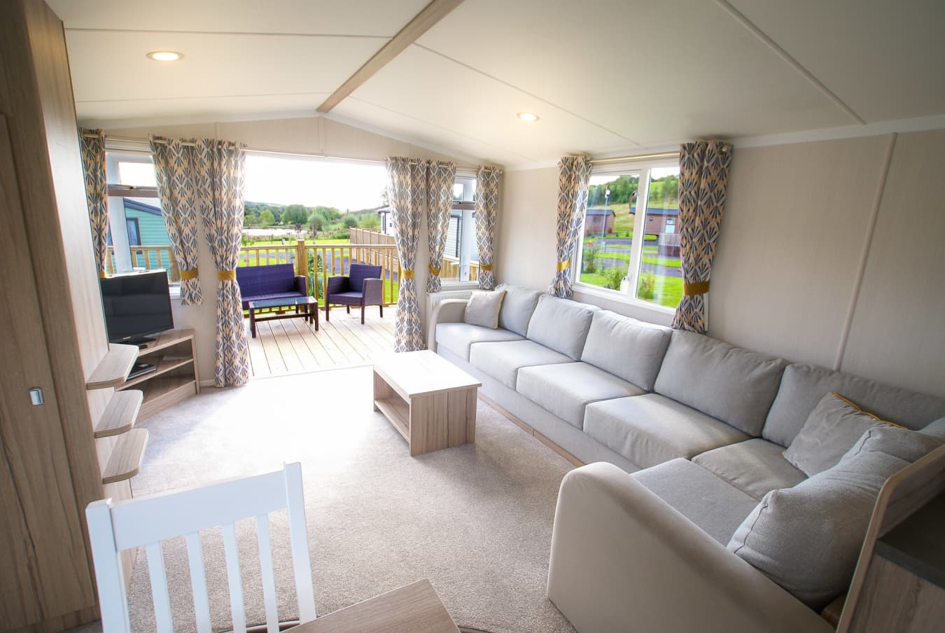 This lovely holiday home is sited on pitch 6 Spruces on our new development side. It has front patio doors with lovely views that open onto a large wrap round decking area with table and chairs to relax on. There is a double bedroom, twin bedroom and a sofa bed in the lounge, and a fully-equipped kitchen with an open living and dining area. The smart TV and 5G router with unlimited data to ensure you are all set up for streaming, browsing or working remotely! The price includes the beds being made up ready for your arrival, towels, electric and gas for your stay. Each holiday home has a private parking space beside it. Please be assured that our holiday homes are spotlessly clean. The arrival time is 4.00pm on day of arrival, with departure by 10.00am so we can carry out the cleaning and preperation for our next guests.