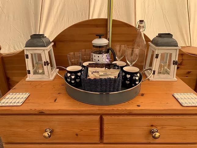 Sleeping for 2 adults and 2 children. New for 2021. A large bell tent with an extra high door. This tent will accommodate a family of four or be spacious for a couple. The tent comes with a real double bed with proper mattress and 2 futon bed chairs. The main beds are covered with 100% cotton sheets, duvet cover and pillow cases. Tea and coffee making facilities are provide along with solar powered lighting.