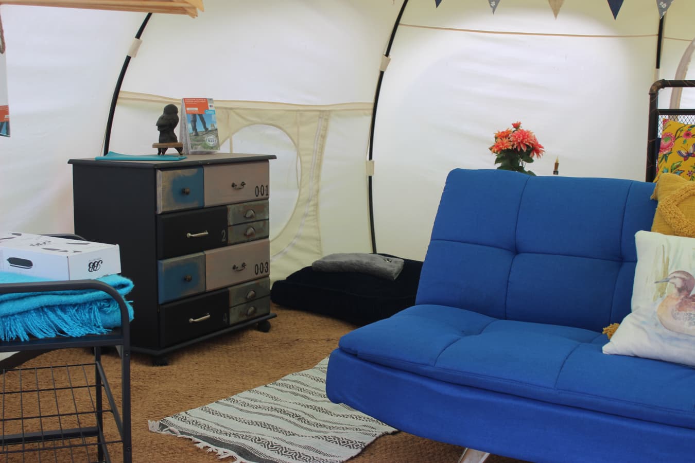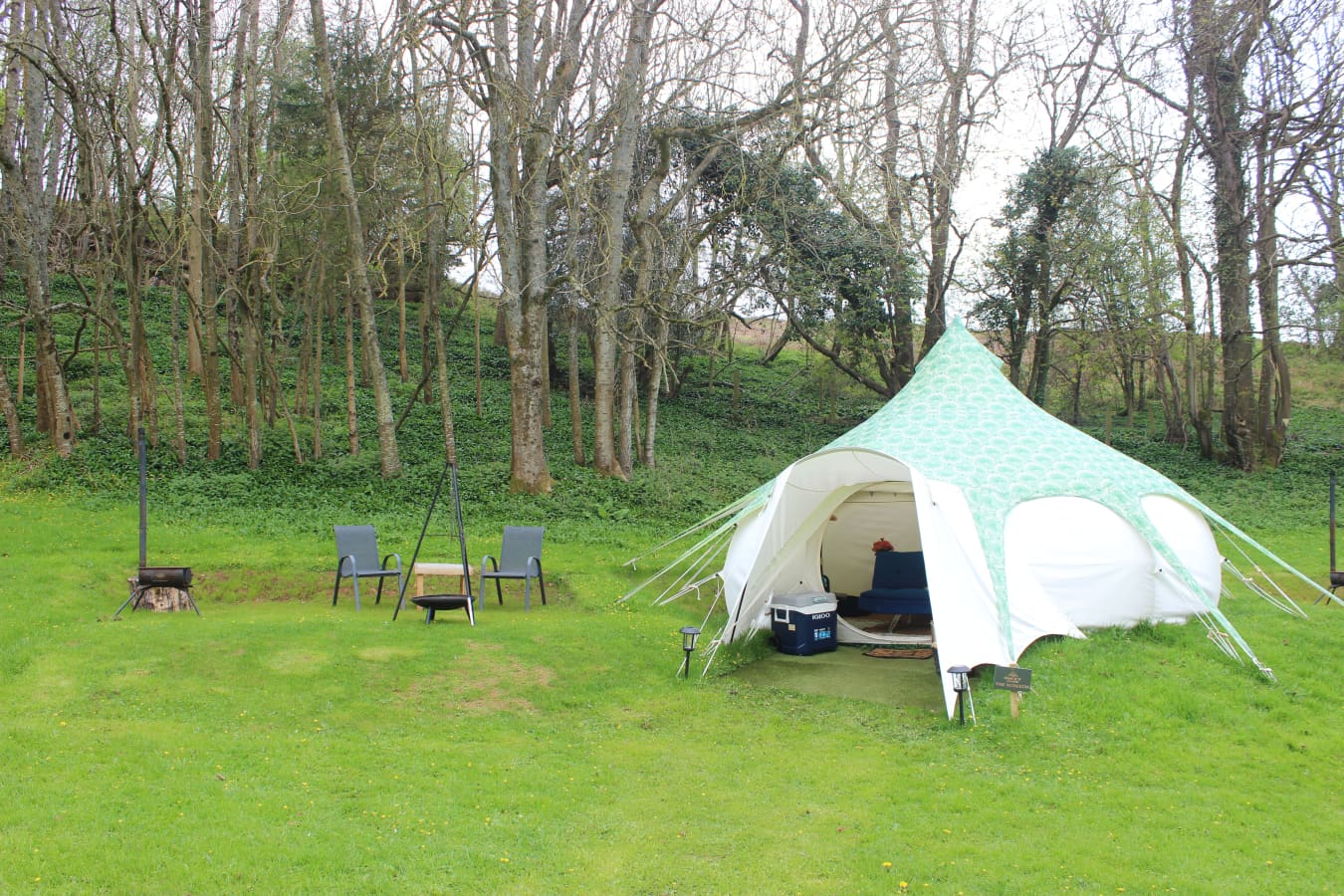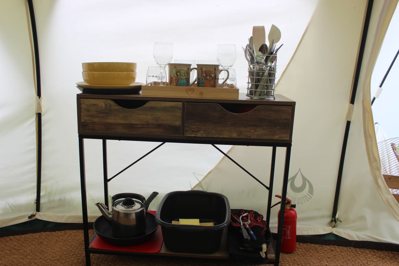 The tents are equipped with Crockery, Cutlery, pans, etc, along with a large cool box to keep your Prosecco cold on the warm evenings. There is an ordnance survey map of the local area, information books and a pair of mini binoculars to help you enjoy your stay. Tea, coffee etc are provided in Cheats Kitchen where you will find the electric kettle, toaster, fridge freezer and mains electric sockets for extra phone charging or hair dryers etc etc.