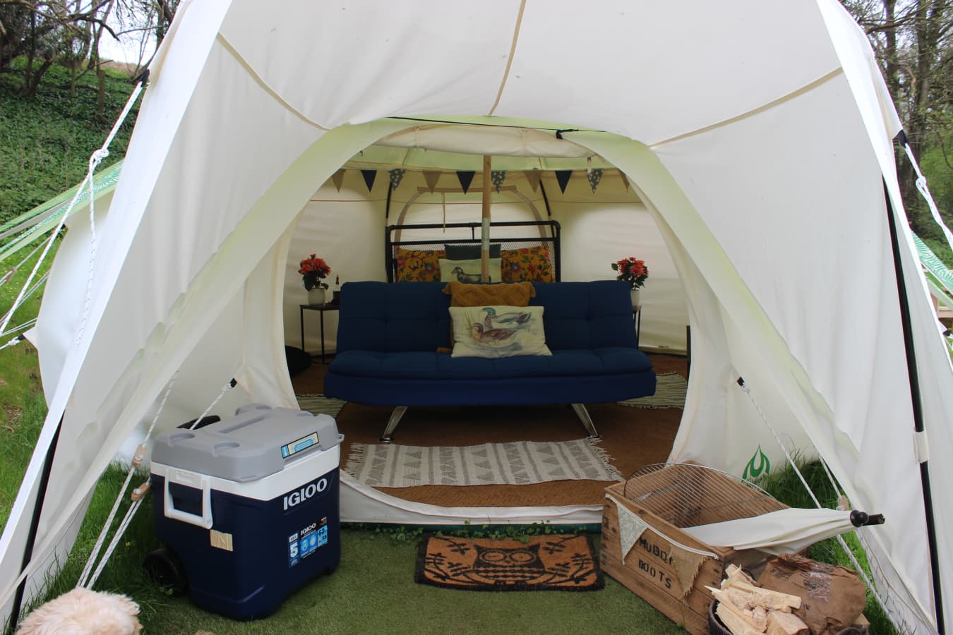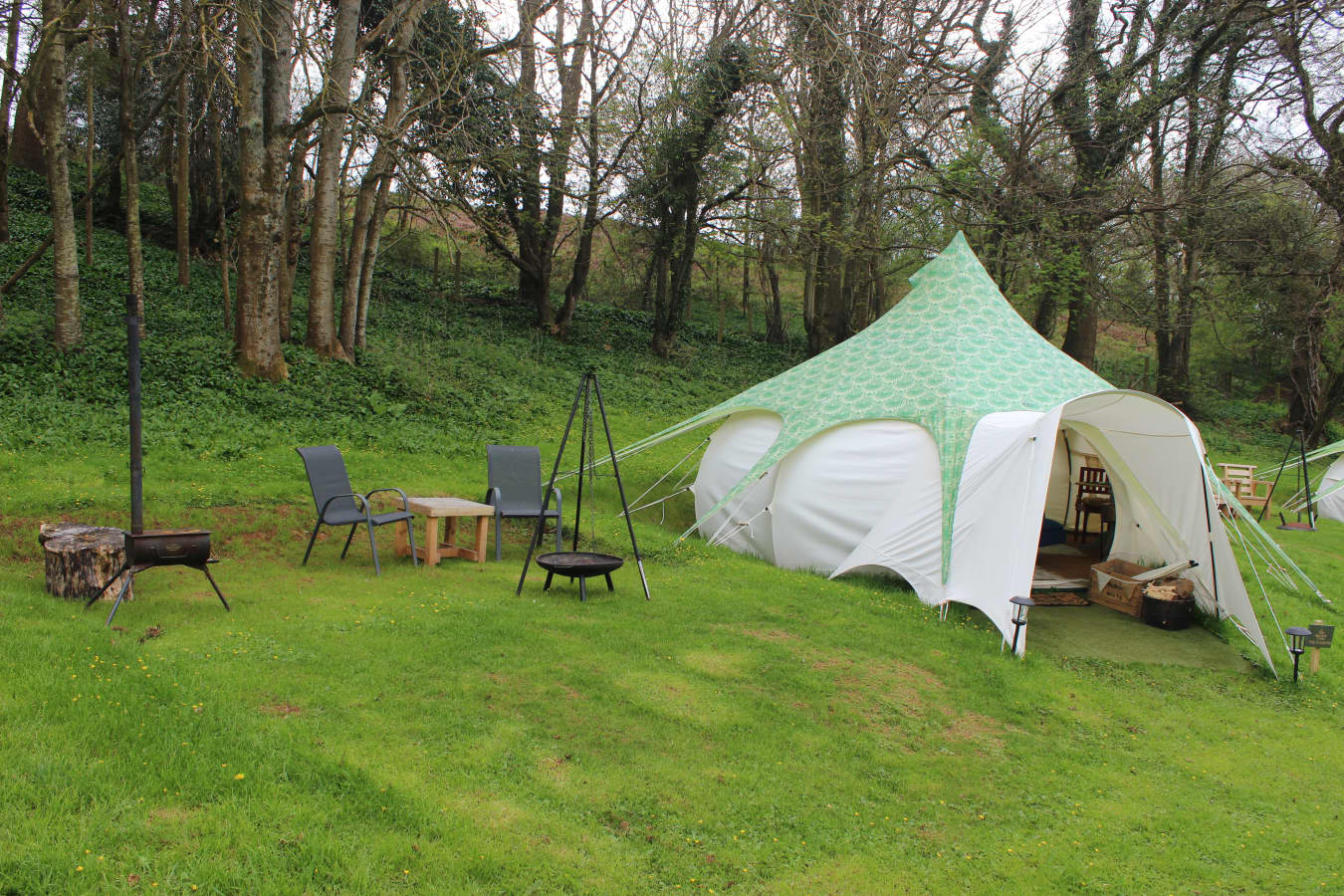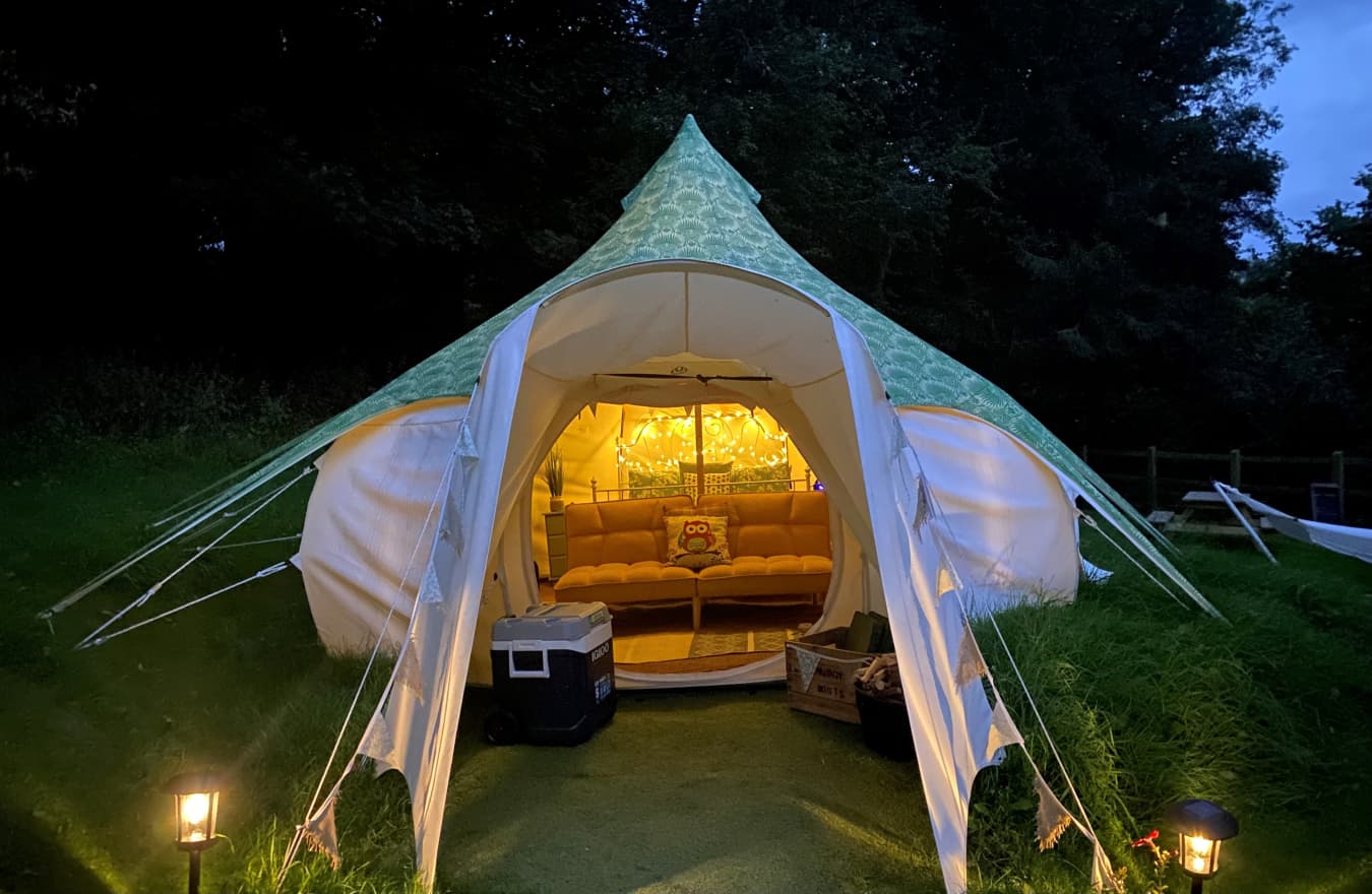 With views over the woodland The Screech Belle is colourful and cosy, with rugs, throws, cushions and a king-size bed with luxury bedding. There are drawers to store your clothes, a sofa to relax on and a table and chairs for indoor dining, all finished with those extra luxury touches and of course bunting and fairy lights. The sofa can become a bed and bedding provided for separate sleeping arrangements or for an extra person when notified in advance. The tents are equipped with Crockery, Cutlery, pans etc along with a large cool box to keep your Prosecco cold on the warm evenings. There is an ordnance survey map of the local area, information books and a pair of mini binoculars to help you enjoy your stay. Tea, coffee etc are provided in Cheats Kitchen where you will find the electric kettle, toaster, fridge freezer and extra charging points for phones etc. Outdoor games are also available in case you would like to enjoy a game of croquet or maybe quoits? Your first basket of logs/kindling/firelighters and a pack of charcoal are provided with extras available in the honesty shop. Complimentary water from Cheddar Springs and Honey from our bee hives at Owley can also be found here. Equipped with almost everything you need, just bring clothes, towels, provisions and a torch for stress free glamping! Powered by Nature! Our tents are off grid, so we provide a solar portable power pack with USB sockets for phone charging (just in case you want to stay in touch with the outside world!), and solar lights for those darker evenings. Lotus Belle Tents really are the top of the range tents made from heavy duty weatherproof canvas. With plenty of room to move around and stand up, it really doesn’t feel like you’re camping! They have a roomy porch area which further extends the living area and is ideal for outdoor clothes, muddy boots etc, there is space for all your needs, and then topped with a leafy green cover to protect the bats and wildlife from any light spill. Outside of your tent, you have a seating area with comfy chairs and table and wood fired stove to boil a kettle or cook breakfast on. To keep you warm and cosy on the cooler summer evening, each tent has a fire pit with additional available hanging grill if you really want to explore your culinary skills. Our onsite facilities were brand new in 2021 and we love our heated wood clad amenity block which has two bathrooms with flushing toilets and hot showers with a separate undercover washing up sink. We are open from March - October and have a two night minimum stay (you will wish you stayed longer!) Owley Woods is a quiet site with a 'no noise' policy after 11pm to preserve the peace and tranquillity of the area Group bookings by prior arrangement only Sorry, but not suitable for stag or hen parties