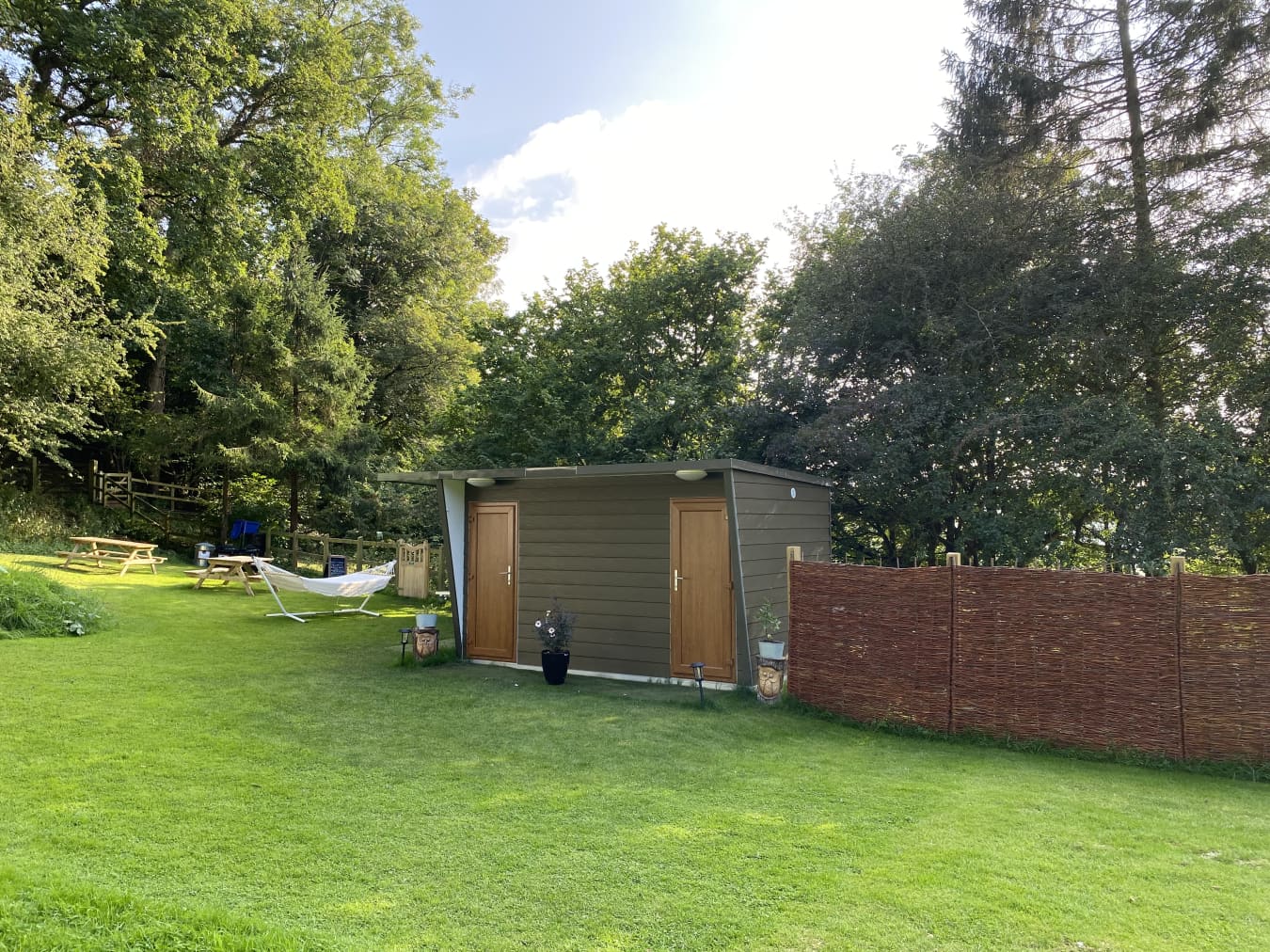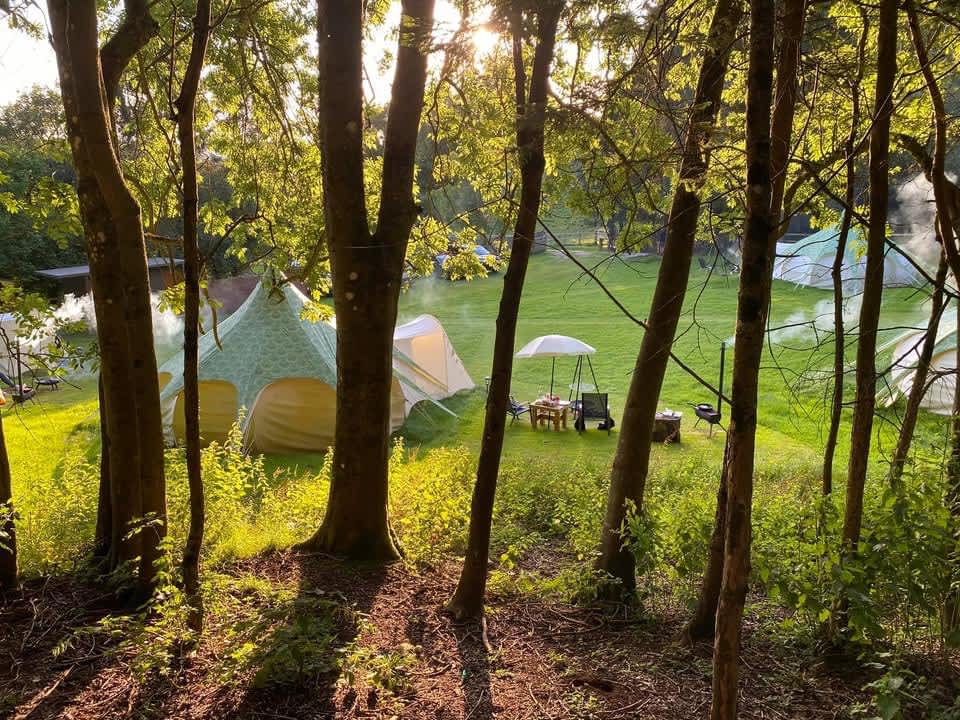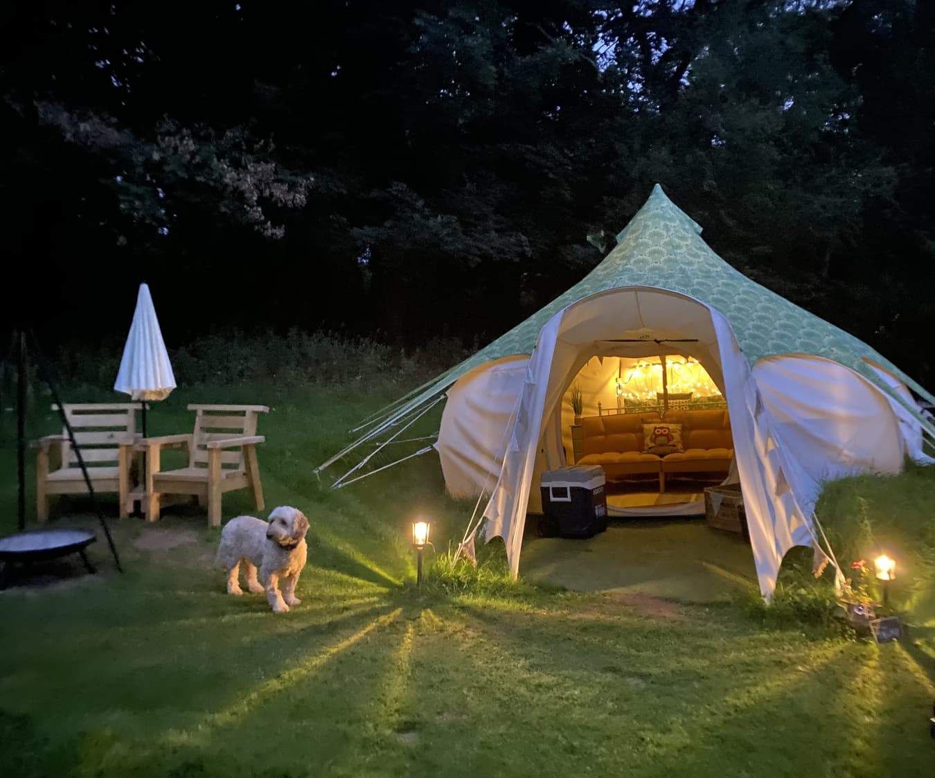 With views over the woodland The Screech Belle is colourful and cosy, with rugs, throws, cushions and a king-size bed with luxury bedding. There are drawers to store your clothes, a sofa to relax on and a table and chairs for indoor dining, all finished with those extra luxury touches and of course bunting and fairy lights. The sofa can become a bed and bedding provided for separate sleeping arrangements or for an extra person when notified in advance. The tents are equipped with Crockery, Cutlery, pans etc along with a large cool box to keep your Prosecco cold on the warm evenings. There is an ordnance survey map of the local area, information books and a pair of mini binoculars to help you enjoy your stay. Tea, coffee etc are provided in Cheats Kitchen where you will find the electric kettle, toaster, fridge freezer and extra charging points for phones etc. Outdoor games are also available in case you would like to enjoy a game of croquet or maybe quoits? Your first basket of logs/kindling/firelighters and a pack of charcoal are provided with extras available in the honesty shop. Complimentary water from Cheddar Springs and Honey from our bee hives at Owley can also be found here. Equipped with almost everything you need, just bring clothes, towels, provisions and a torch for stress free glamping! Powered by Nature! Our tents are off grid, so we provide a solar portable power pack with USB sockets for phone charging (just in case you want to stay in touch with the outside world!), and solar lights for those darker evenings. Lotus Belle Tents really are the top of the range tents made from heavy duty weatherproof canvas. With plenty of room to move around and stand up, it really doesn’t feel like you’re camping! They have a roomy porch area which further extends the living area and is ideal for outdoor clothes, muddy boots etc, there is space for all your needs, and then topped with a leafy green cover to protect the bats and wildlife from any light spill. Outside of your tent, you have a seating area with comfy chairs and table and wood fired stove to boil a kettle or cook breakfast on. To keep you warm and cosy on the cooler summer evening, each tent has a fire pit with additional available hanging grill if you really want to explore your culinary skills. Our onsite facilities were brand new in 2021 and we love our heated wood clad amenity block which has two bathrooms with flushing toilets and hot showers with a separate undercover washing up sink. We are open from March - October and have a two night minimum stay (you will wish you stayed longer!) Owley Woods is a quiet site with a 'no noise' policy after 11pm to preserve the peace and tranquillity of the area Group bookings by prior arrangement only Sorry, but not suitable for stag or hen parties