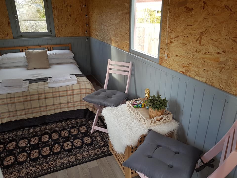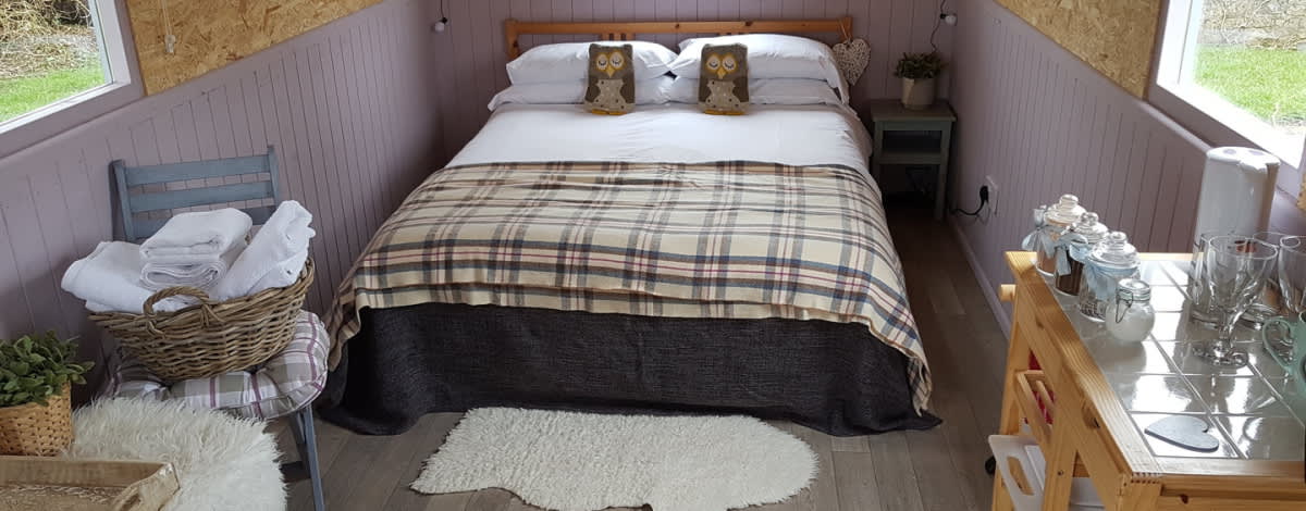 Beautiful shepherds huts ready for your glamping experience. They are equipped to make your stay as relaxing as possible. Each Hut has a double bed, bed side storage tables. Each of the Huts has a small kitchen unit, all with cutlery, crockery, mugs and glasses. There is a kettle and some coffee, tea & hot chocolate, to help make your stay enjoyable. Also in each hut there is a 2-ring camping gas cooker , along with pots and pans. Outside in the Glamping meadow, there are BBQ's available for use by our glampers.We provide all the bedding and towels, along with some warm extras, lovely snuggly blankets and hot water bottles.